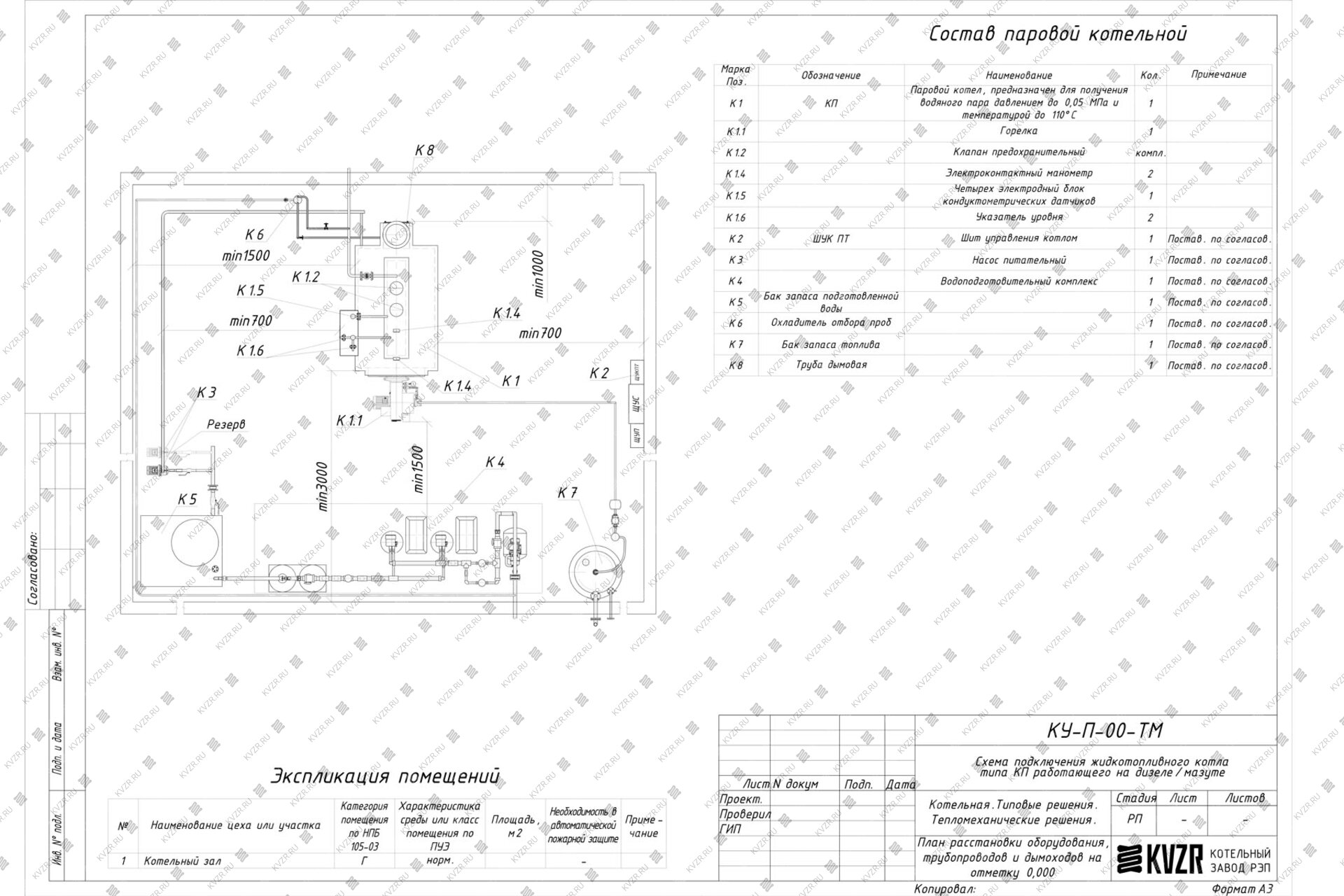 Для эффективной и надежной работы парового котла КП 2000 на мазуте в вашей котельной вам потребуется дополнительное оборудование - автоматика ЩУК, горелка импортного или отечественного производства, насос сетевой и подпиточный, регулятор давления газа (по необходимости), газоходы и переходники для газового тракта, дымовая труба. Мы предлагаем рассмотреть типовые варианты комплектации.