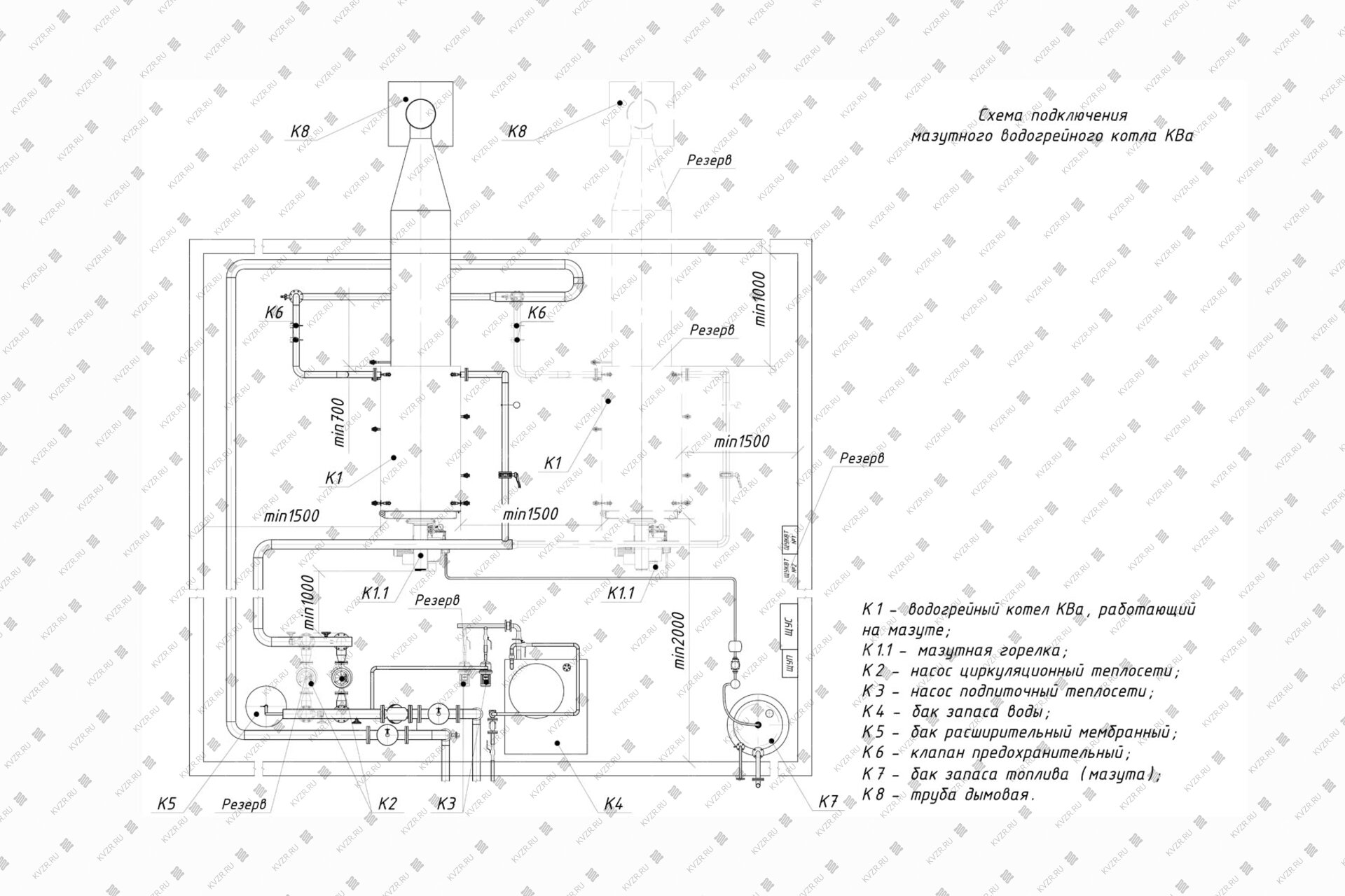 Чтобы правильно подключить котел 2.2 МВт на мазуте в котельной необходимо оставить проемы для обслуживания оборудования во время эксплуатации. На представленной здесь схеме указаны их минимальные размеры. Кроме того, в данной примерной схеме монтажа водогрейных котлов и оборудования указан перечень минимально необходимого вспомогательного оборудования для правильной работы котла.