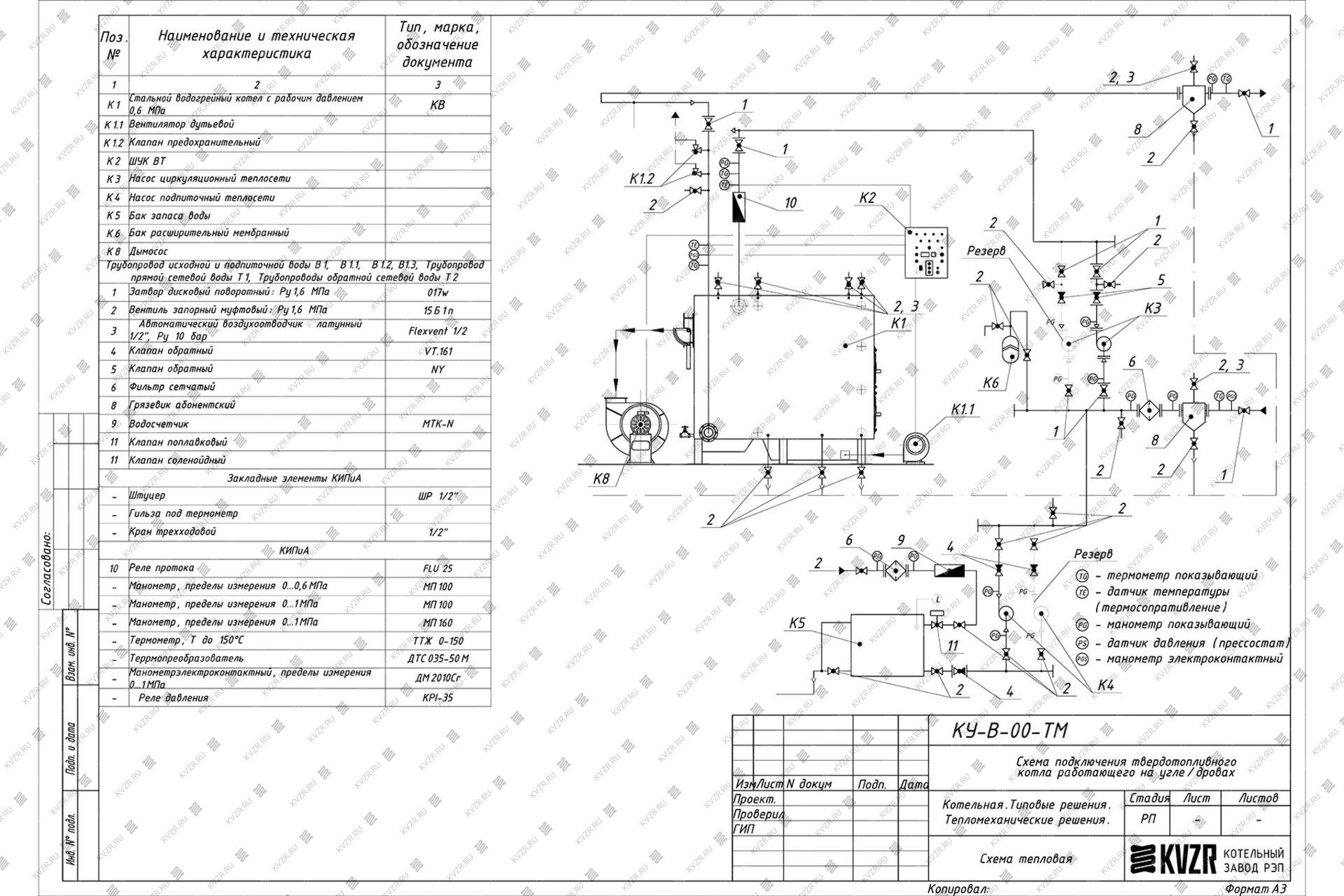 Образец тепловой схемы подключения котла 400 кВт уголь дрова и вспомогательного оборудования в котельной приведен на данной схеме. При эксплуатации очень важно грамотно осуществить подключение оборудования, установить все контрольно измерительные приборы, для контроля параметров работы котельной и запорную арматуру для оперативного переключения потока теплоносителя при плановой или аварийной остановке оборудования. Данную схему можно использовать как пример для разработки под свой объект или заказать у нас разработку индивидуальной схемы для вашей котельной.