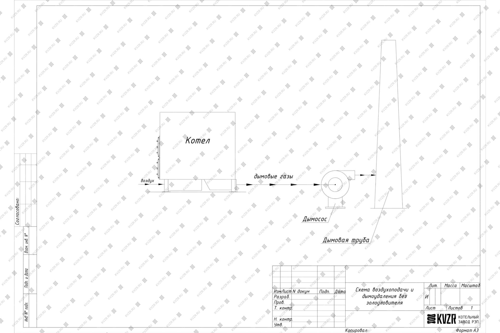 Автоматика котла по данным тягонапорометра производит контроль разряжения в топочной камере, блокируя работу вентилятора в случае снижения разряжения в топочной камере, и исключая выбивание дымовых газов из топки в котельный зал. Из топки дымовые газы поступают в первый конвективный пакет, разворачиваются в поворотном коробе и через второй конвективный пакет выходят в газоходы котельной.