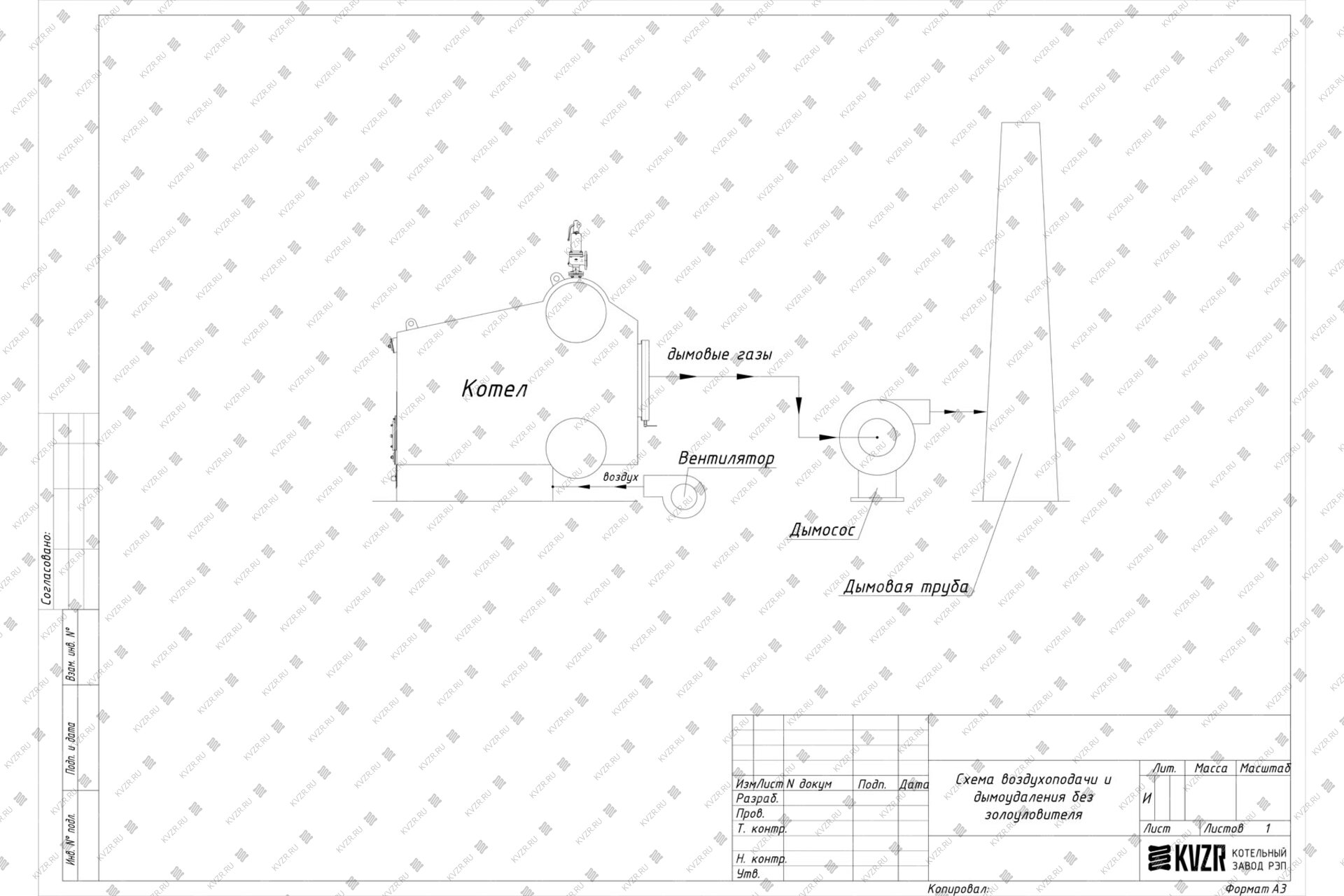 Если вам не требуется высокая очистка дымовых газов, котел может работать без золоуловителя. Схема подключения при этом следующая - дымовые газы выходят из котла в газоходы котельной, затем в дымосос и далее снова по газоходам в дымовую трубу. В зависимости от компоновки котельной дымосос может устанавливаться как в котельной, так и на улице. Наш завод производит газоходы и переходники к ним. Получив схему вашей котельной мы можем изготовить для вас комплект газоходов, переходников нужных размеров и сечений. На месте такие детали собираются как конструктор. Обращаем ваше внимание, что газоходы требуют изоляции, для защиты персонала от ожогов, так как уходящие газы имеют высокую температуру, а на улице газоходы требуют изоляции для избежания образования конденсата.