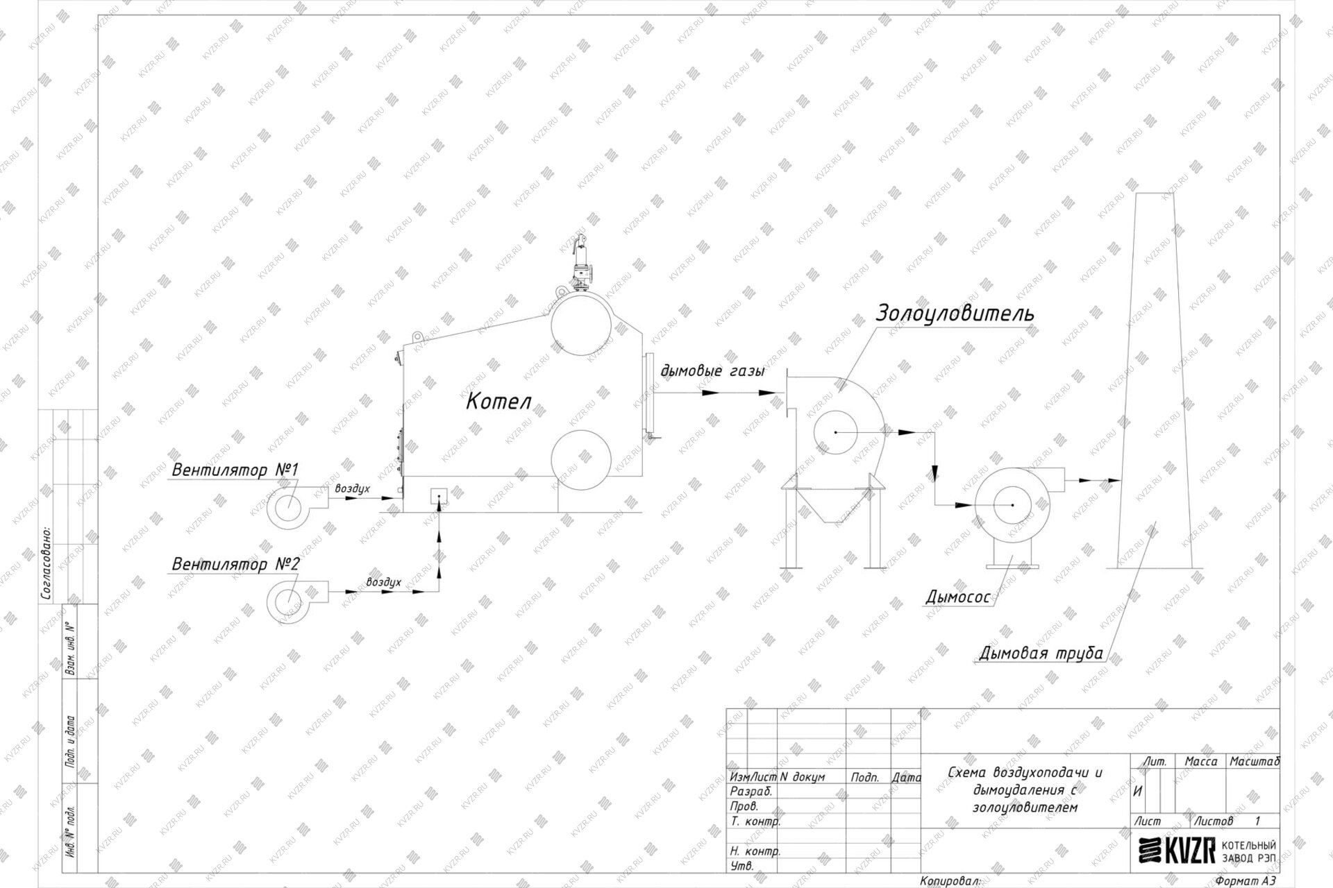 Если вам не требуется высокая очистка дымовых газов, котел может работать без золоуловителя. Схема подключения при этом следующая - дымовые газы выходят из котла в газоходы котельной, затем в дымосос и далее снова по газоходам в дымовую трубу. В зависимости от компоновки котельной дымосос может устанавливаться как в котельной, так и на улице. Наш завод производит газоходы и переходники к ним. Получив схему вашей котельной мы можем изготовить для вас комплект газоходов, переходников нужных размеров и сечений. На месте такие детали собираются как конструктор. Обращаем ваше внимание, что газоходы требуют изоляции, для защиты персонала от ожогов, так как уходящие газы имеют высокую температуру, а на улице газоходы требуют изоляции для избежания образования конденсата.